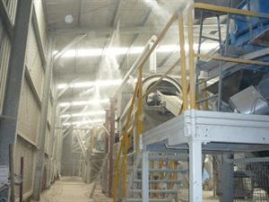 The atomization lines are either fixed to the building structure with mist blown over the nominated areas or suspended above the area on a stainless steel cable. The stainless steel cable is fixed to the building structure and tensioned to support atomization lines. Atomization lines are spread evenly across the area to provide complete coverage and suppress dust.